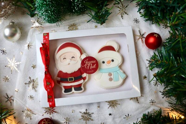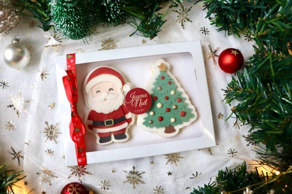 Plongez dans la magie des fêtes avec ce joli coffret composé de 2 biscuits décorés en pâte à sucre, entièrement faits main.